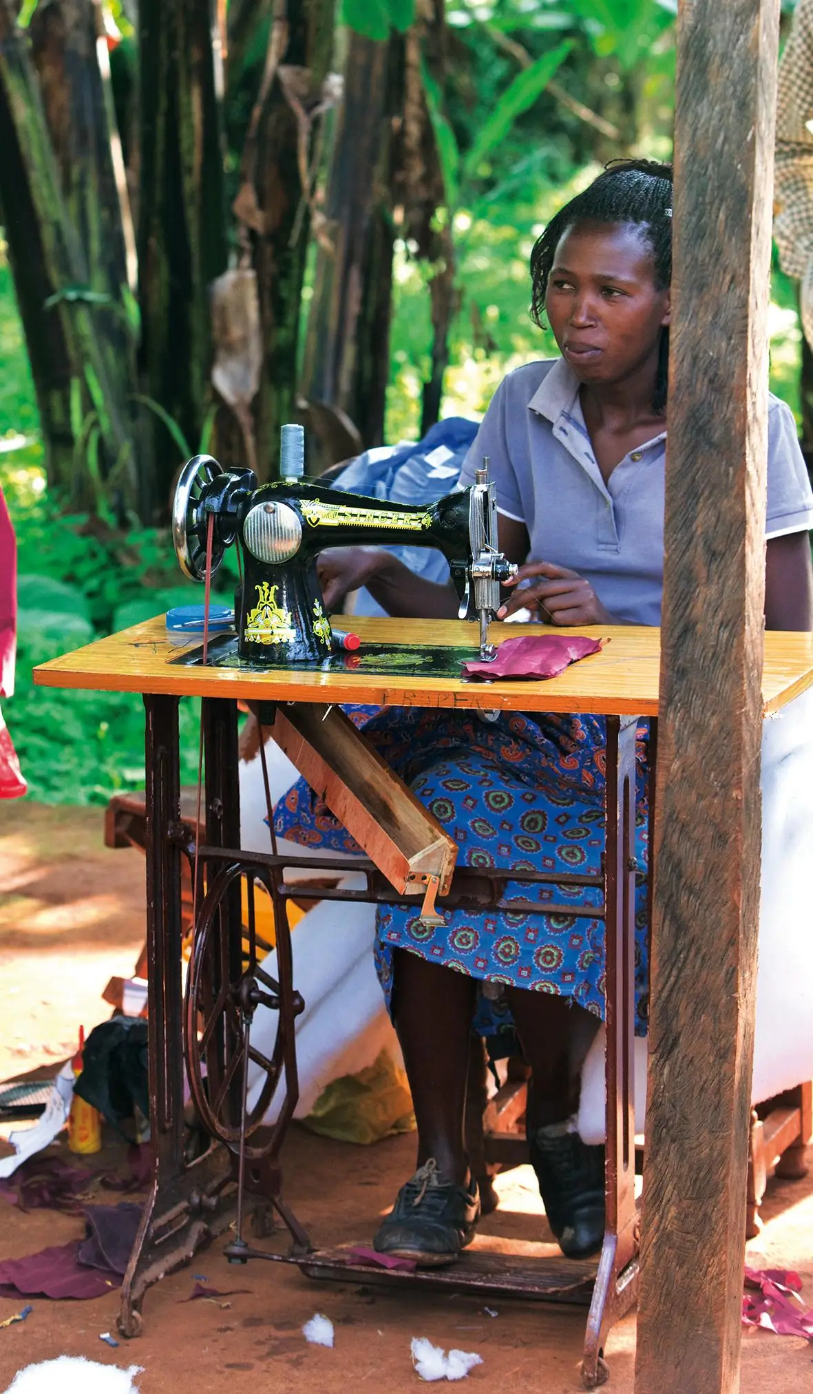 Men de bliver også hjemme, når de har deres menstruationsperioder på grund af manglende hygiejnefaciliteter. I hvert distrikt har en gruppe af disse frafald deltog i kurser for at lære at sy. Blandt de produkter, de opretter, er vaskbare menstruationspuder og skoleuniformer. En indkomst er sikret for disse ellers dårligt stillede piger.