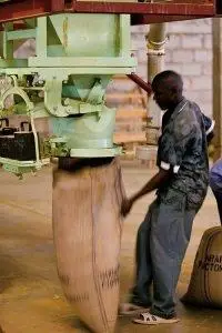 This machine takes a manifold of coffee beans, also called silver skin. Coffee beans are sorted into various sizes from A to AA. Each cofee bag is automatically filled to weigh 60 kg.